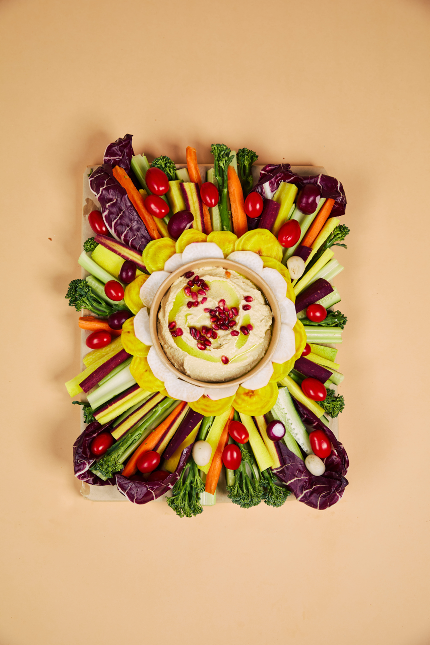 Unsere Crudités-Platte bringt frisches Gemüse auf den Tisch – liebevoll angerichtet und perfekt zum Dippen in cremigen Hummus.